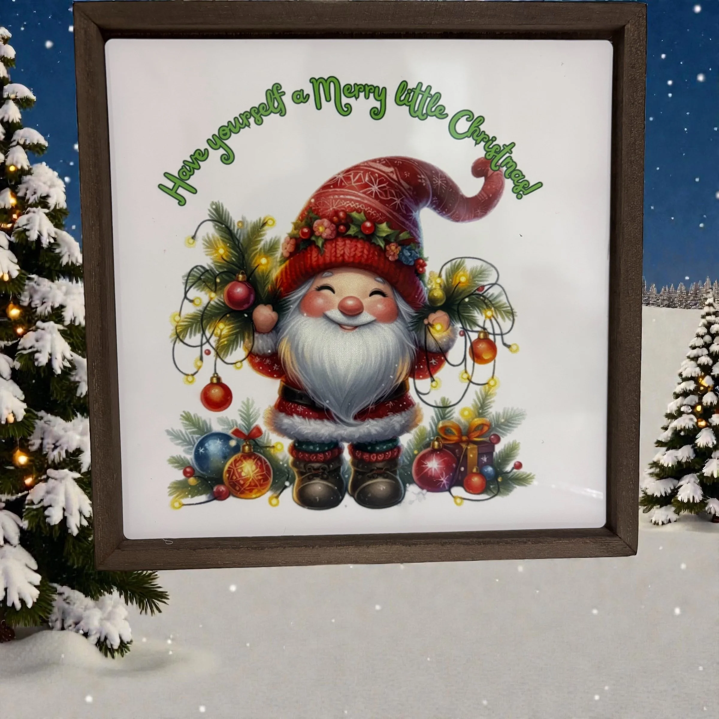 This 7.5 inch square wooden frame has a sublimation gnome. It says Have yourself a Merry Little Christmas. It can be hung up or stand on a shelf.