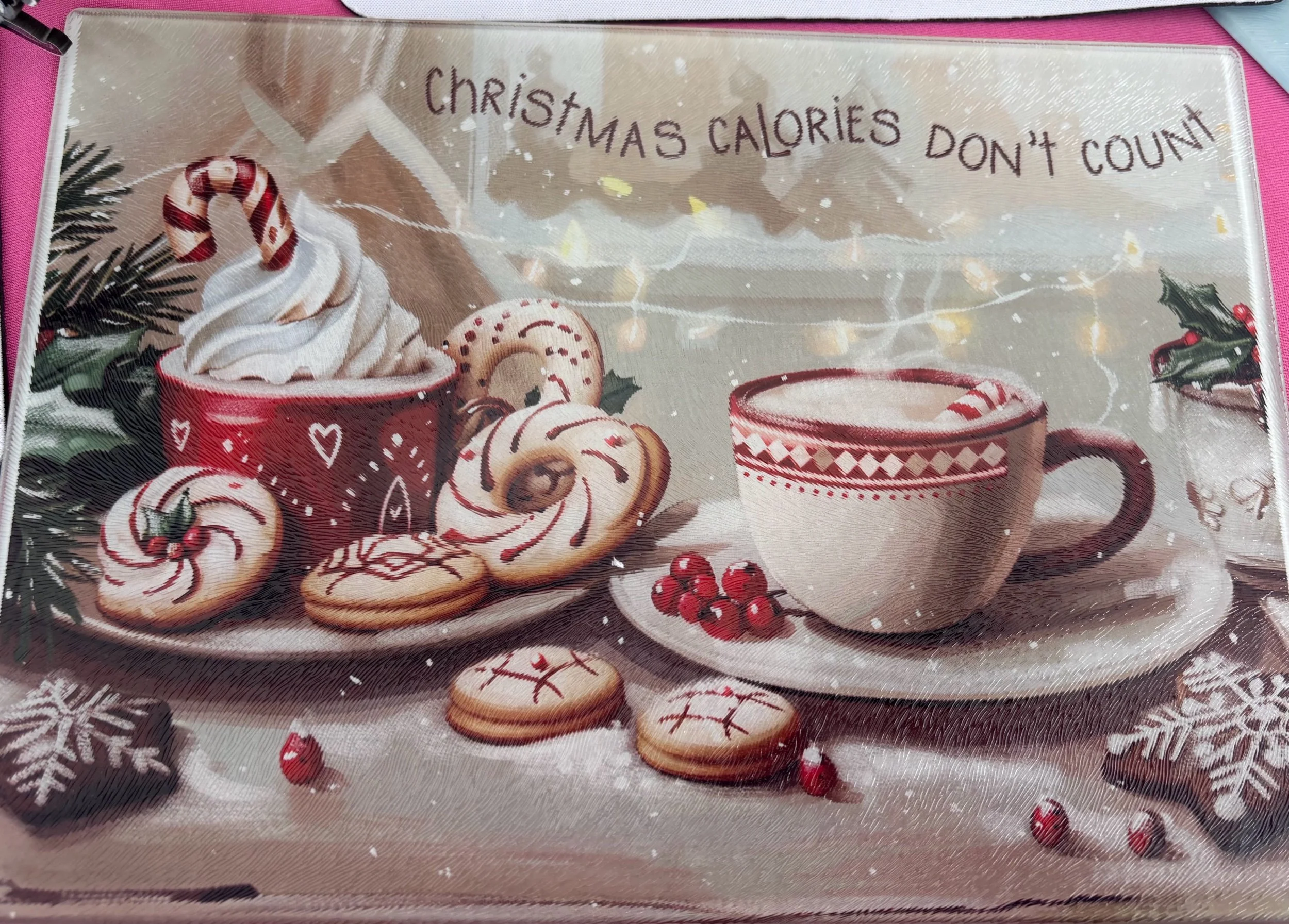 Shop › Christmas calories don’t count cutting board Image 1 of 1 Christmas calories don’t count cutting board $18.00 This glass cutting board features cookies and says Christmas calories don’t count. It’s 11x8. And it can be washed. Quantity: Add To Cart Added! This glass cutting board features cookies and says Christmas calories don’t count. It’s 11x8. And it can be washed.