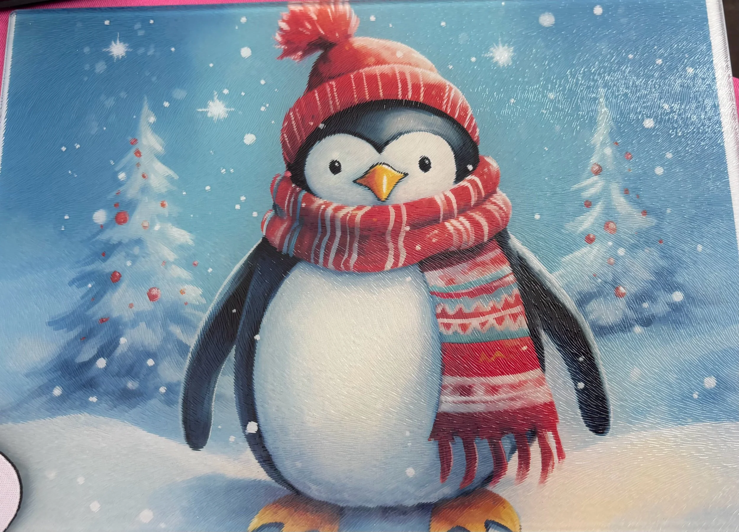 Shop › Penguin cutting board Image 1 of 1 Penguin cutting board $18.00 Cute little penguin in a scarf. This is a glass cutting board that is 11x8. It can be washed Quantity: Add To Cart Added! Cute little penguin in a scarf. This is a glass cutting board that is 11x8. It can be washed