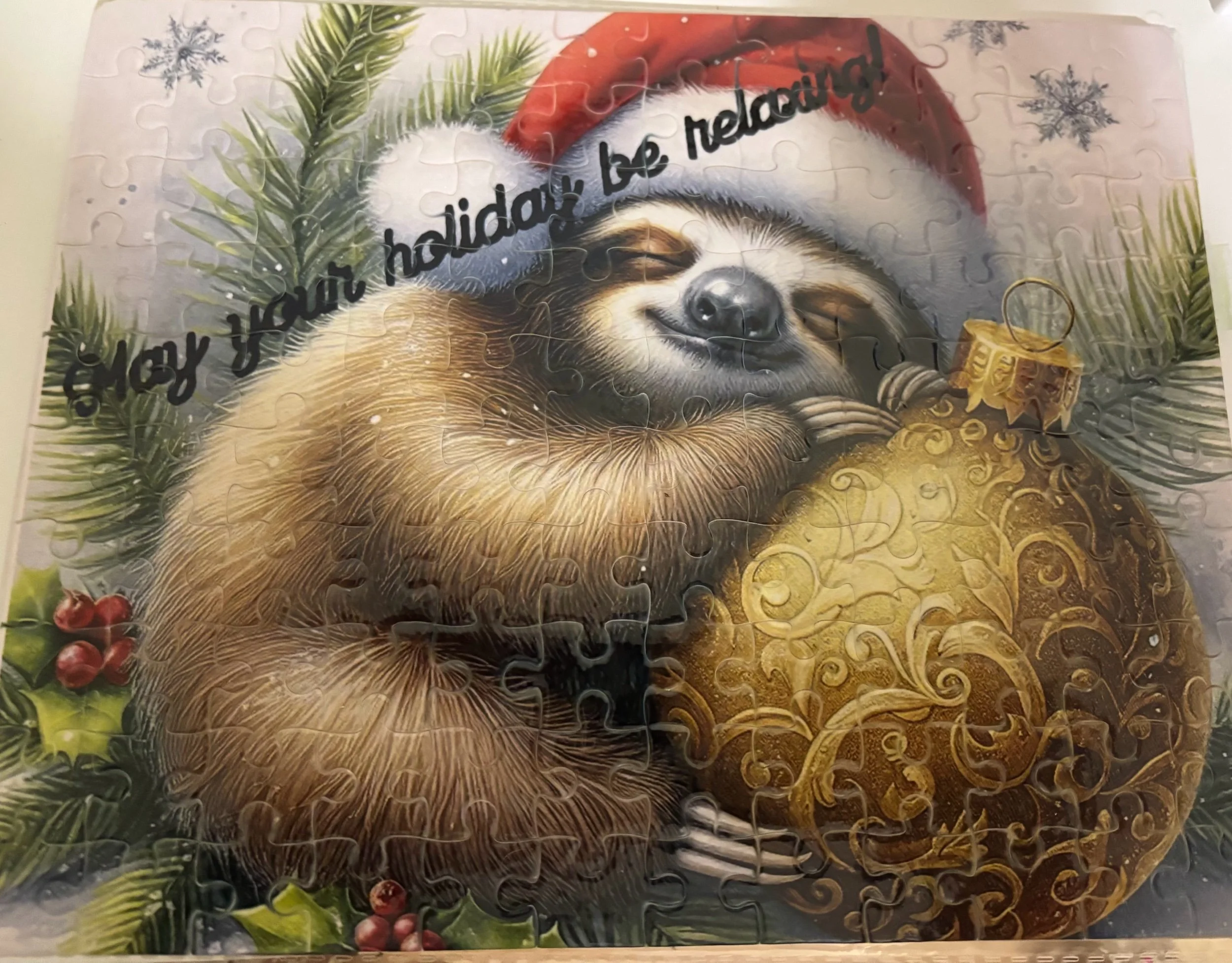 This 120 piece puzzle features a sleeping sloth with a Christmas ornament. It is a full color picture and measures 8 X 11 inches.