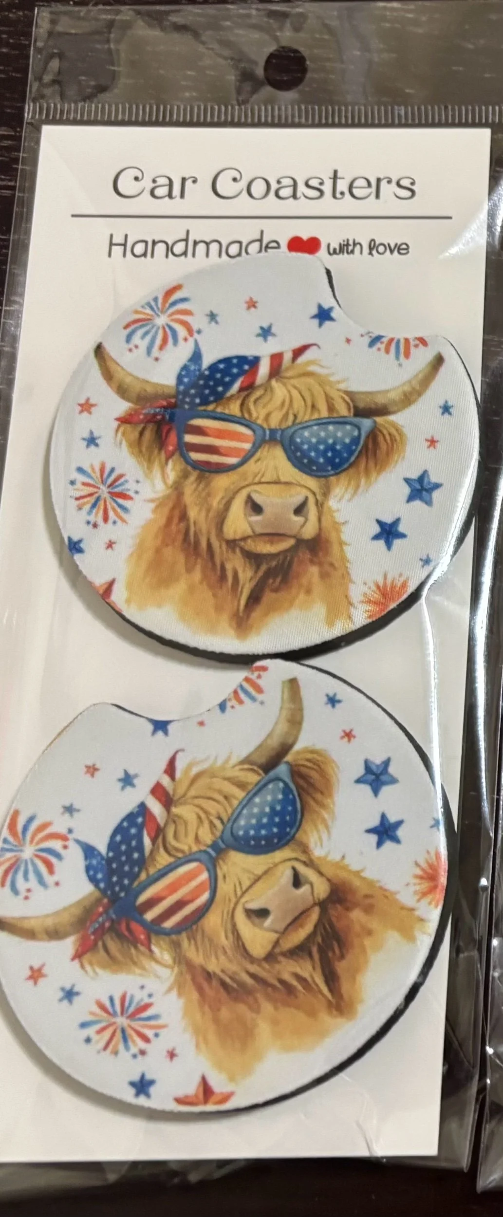 Shop › Patriotic cow car coasters Image 1 of 1 Patriotic cow car coasters $5.00 This set of car coasters is so cute. It will decorate your car! Add To Cart Added! This set of car coasters is so cute. It will decorate your car!